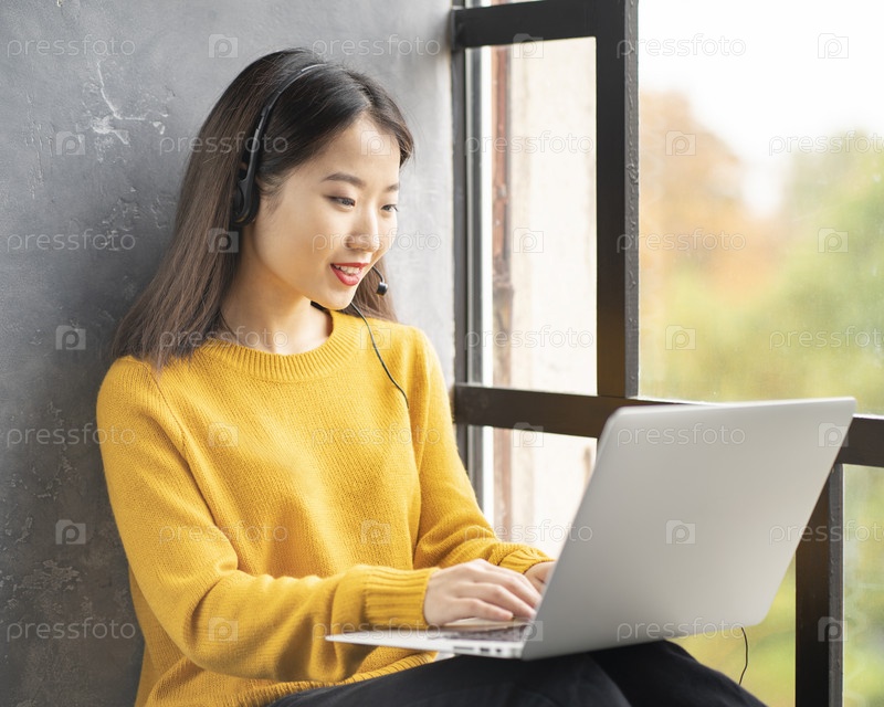 Азиатская женщина работает на ноутбуке дома или в кафе у окна. Молодая женщина в ярко-желтом свитере сидит и печатает на компьютере. Деловая восточная леди на подоконнике
