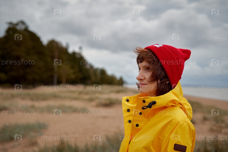 Единение с природой. Зрелая красивая женщина смотрит в лес в ярко-желтой куртке и красной шляпе