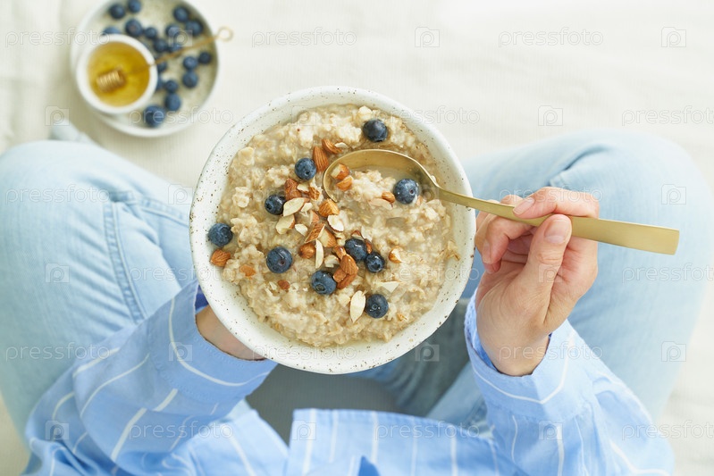 Вид сверху безликая женщина, держащая тарелку овсянки, сидящая в постели рано утром