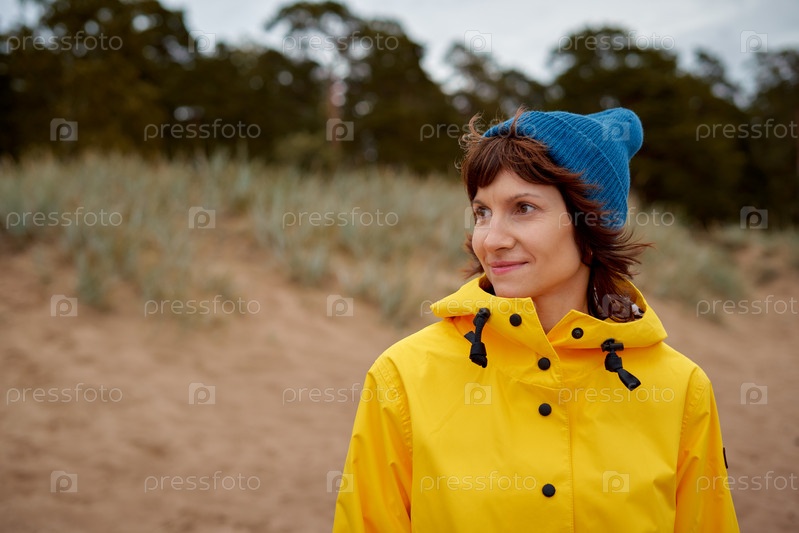 Единение с природой. Зрелая красивая женщина смотрит в лес в ярко-желтой куртке и синей шляпе