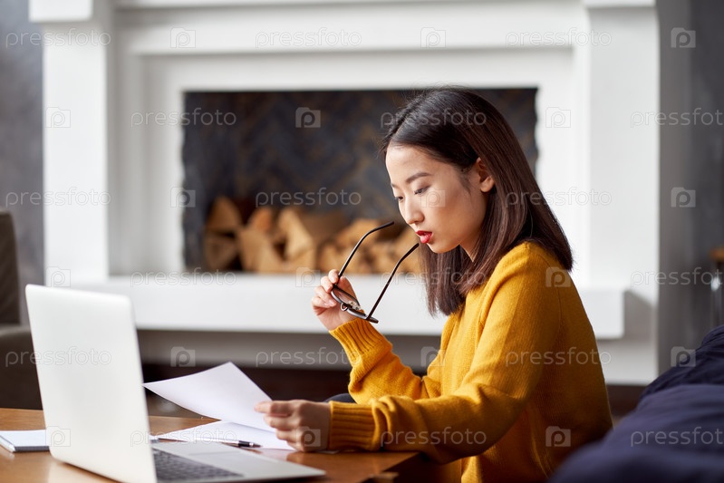 Азиатская женщина работает дома и смотрит документы. Красивая японка