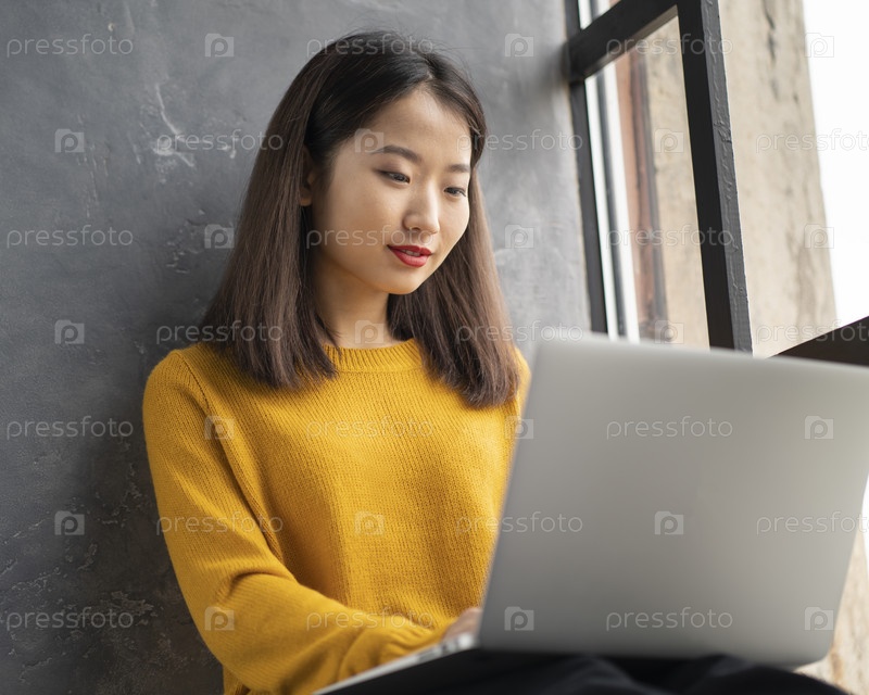 Азиатская женщина работает на ноутбуке дома или в кафе у окна. Молодая женщина в ярко-желтом свитере сидит и печатает на компьютере. Деловая восточная леди на подоконнике