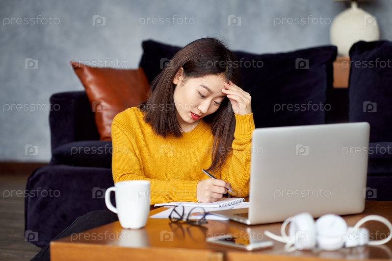 Азиатская женщина работает дома, пишет блокнот, фрилансер. Переутомление, заполнение бумаг