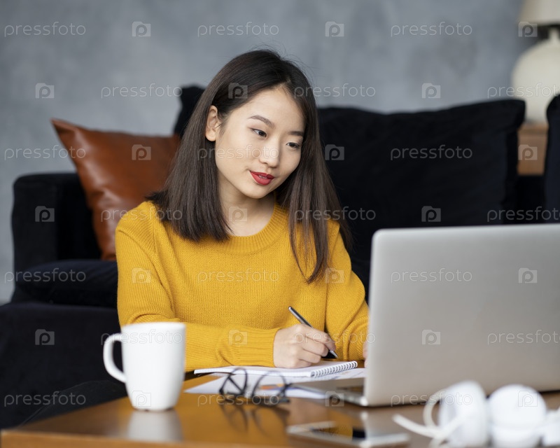 Азиатская женщина работает на ноутбуке дома или в отеле. Девушка в ярко-желтом свитере