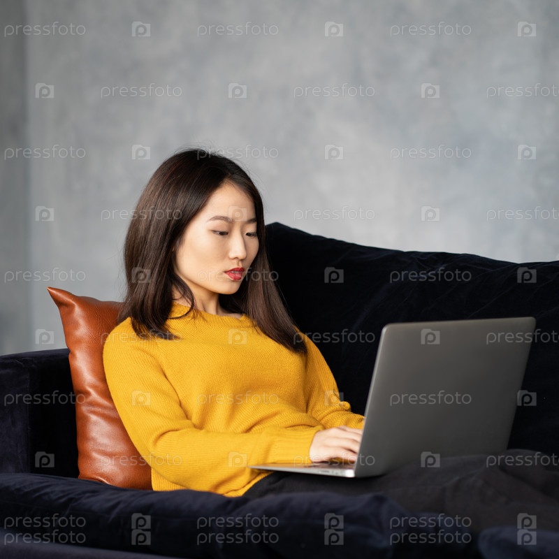 Азиатская женщина смотрит на ноутбук, работает дома, лежа на диване. Несчастная, расстроенная японка