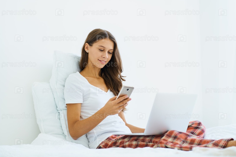 Молодая женщина делает покупки в Интернете, вводит код из СМС-сообщения на мобильный телефон, безопасность интернет-покупок.Женщина сидит на кровати в спальне и работает дома с помощью ноутбука