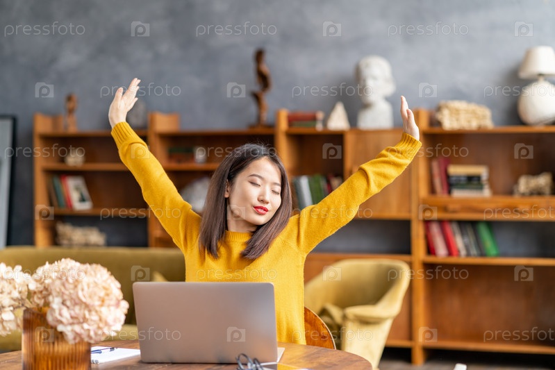 Азиатская женщина работает на ноутбуке дома или в кафе, устало потягиваясь