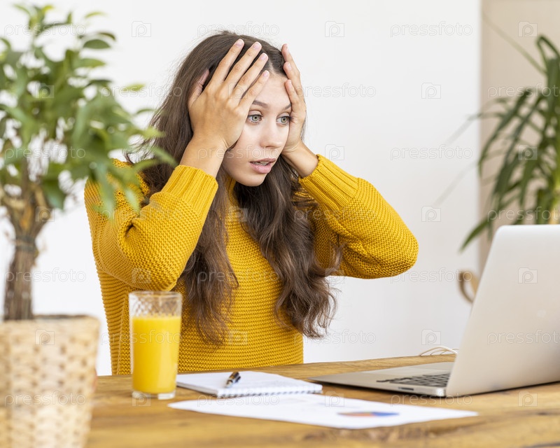 Девушка удивлена, расстроена, на лице ужас. Красивая молодая женщина, работающая на ноутбуке