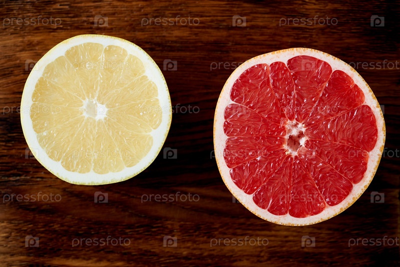 Две половинки красного и белого грейпфрута, яркие круги на темном деревянном фоне. цитрусовые