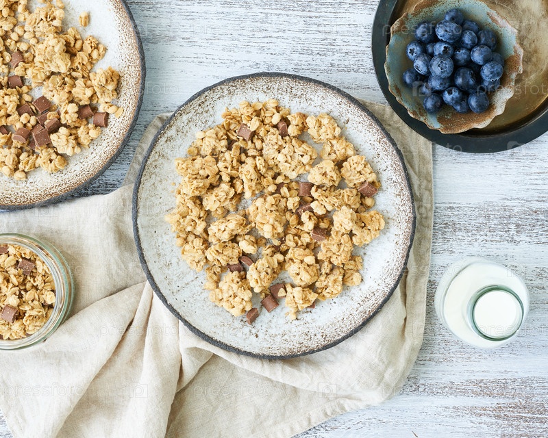 Йогурт с шоколадной гранолой, черникой. Завтрак, здоровая диетическая еда с овсяными хлопьями, орехами, бананом, деревенским деревянным столом, вид сверху