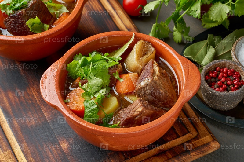 Гуляш с крупными кусочками говядины и овощами. Мясо по-бургундски. Медленное тушение, приготовление в двух кастрюлях или чугунной сковороде. Темный фон. Вид сбоку