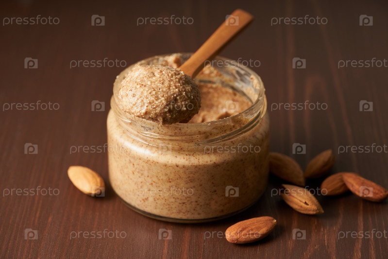 Миндальное масло, сырая пищевая паста, приготовленная из измельченного миндаля в ореховое масло, хрустящая и перемешиваемая, темно-коричневый деревянный стол, пространство для копирования, вид сбоку, крупный план