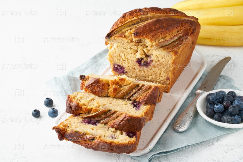 Домашний банановый хлеб. Испеченный пирог. Вид сверху, белый стол. Традиционная американская кухня. Кусок хлеба