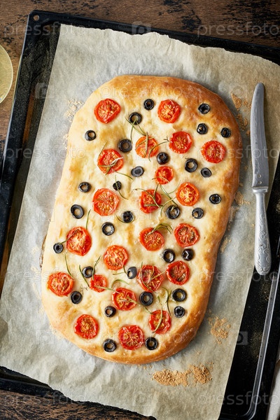 Фокачча, пицца, итальянская лепешка с помидорами, оливками и розмарином на подносе