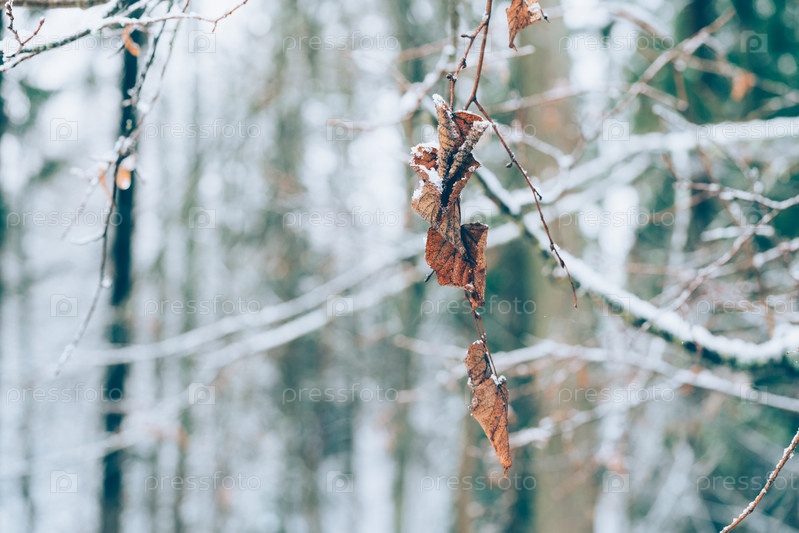Старые листья покрыты инеем. Утренний туман в зимнем лесу. Селективный фокус
