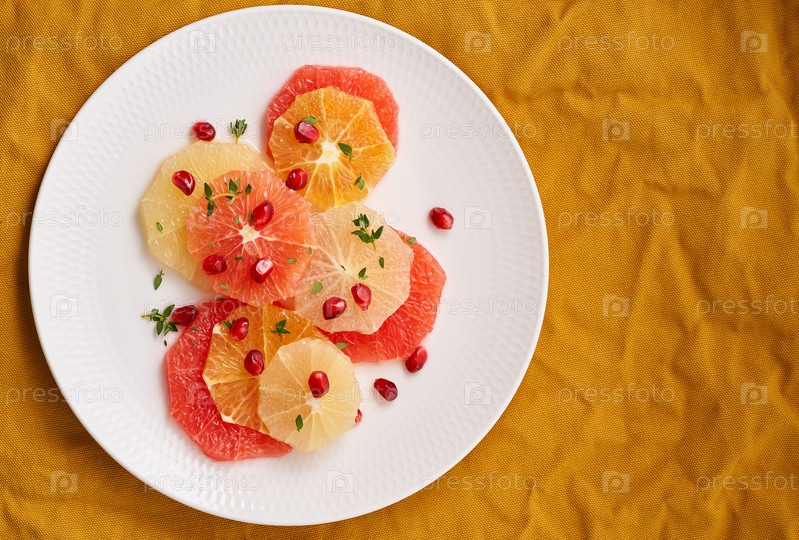 Яркий микс цитрусовых. Салат из смеси нарезанных круглых ломтиков красного и белого грейпфрута, посыпанных зернами граната, на белой тарелке на желтом белье. Копировать пространство