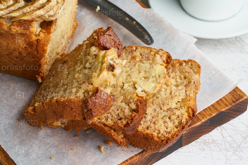 Банановый хлеб. Торт с бананом, традиционная американская кухня. Кусок хлеба. Вид сверху, крупным планом
