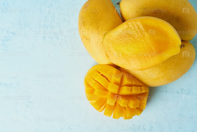 Четыре целых плода манго на ярко-синем столе и нарезанные ломтиками. Большие сочные ярко-спелые желтые фрукты на цветном фоне, крупным планом, копией пространства