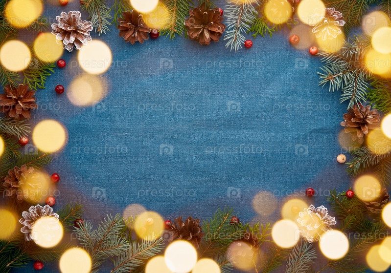 Рождество и Новый год темно-синий фон с пространством для текста и боке световой гирлянды