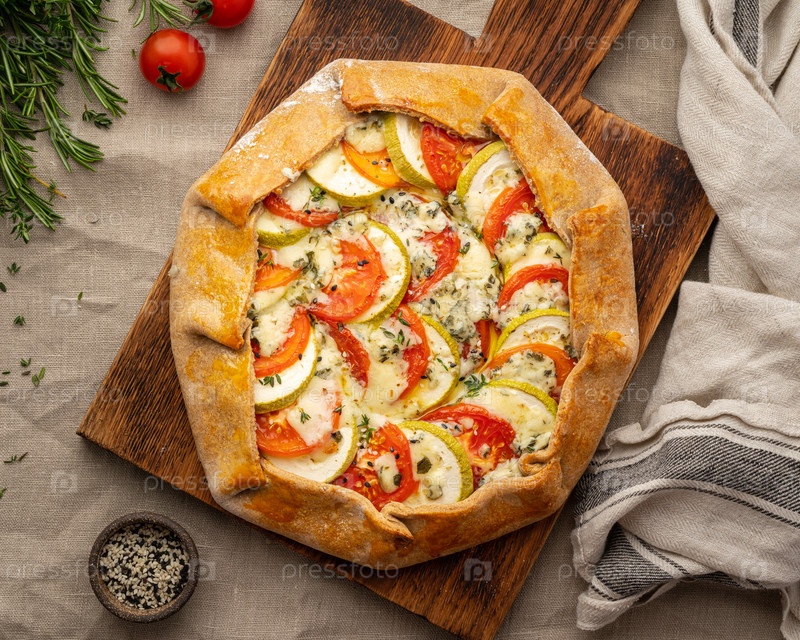 Домашняя пикантная галета с овощами, пшеничный пирог с помидорами, кабачками, сыром Горгонзола с плесенью. Деревенские кростаты из корочки на темной льняной текстильной скатерти. Вид сверху