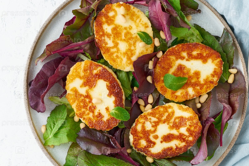 Жареный кипрский халлуми с салатным миксом и свекольным ботом. Lchf, пеган, fodmap, палео, scd, кето, кетогенная диета. Сбалансированное питание, рецепт чистого питания. Вид сверху, белый фон, крупный план
