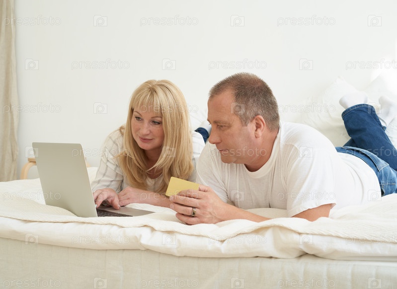 Пожилая семейная пара сидит в постели в современном доме и смотрит на экран ноутбука