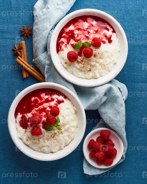 Рисовый пудинг. Французский молочно-рисовый десерт с малиной, черникой, ягодами, джемом. Здоровый веганский диетический завтрак с кокосовым молоком и корицей. Синий льняной текстиль. Вид сверху, вертикальный