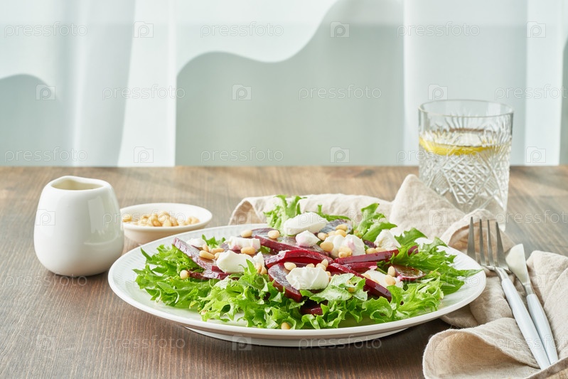 Салат со свеклой, творогом, фетой, рикоттой и кедровыми орешками, листьями салата. Здоровая кето-кетогенная диета, темный стол, вид сбоку