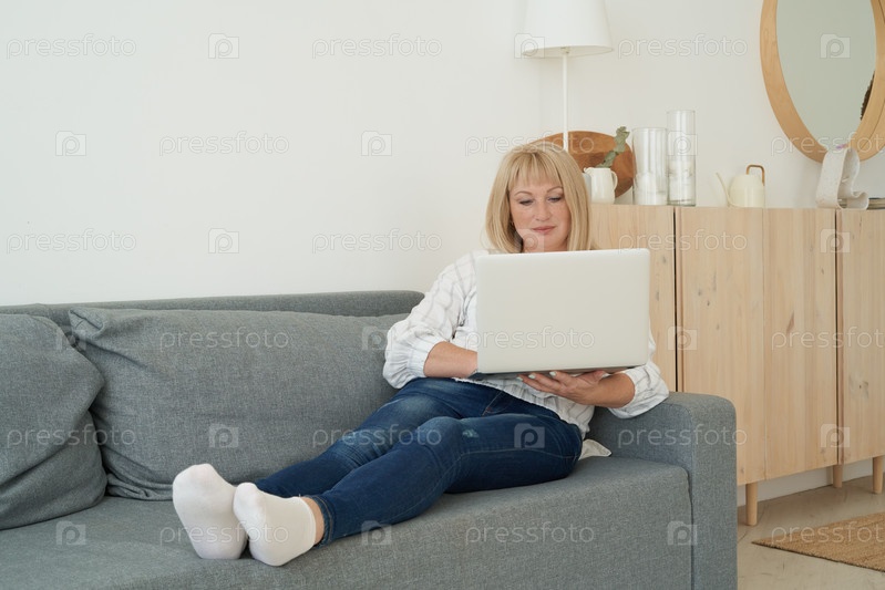 Зрелая женщина пользуется ноутбуком, сидя на удобном диване, домашний интерьер. Красивая женщина в полный рост делает покупки или общается онлайн в социальной сети, смотрит фильм, работает фрилансером