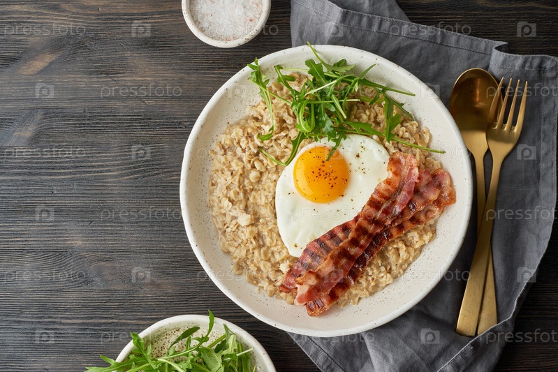 Овсянка, жареное яйцо и жареный бекон. Жестокий мужчина, спортивный завтрак. Сытный жирный калорийный завтрак, источник энергии. Баланс белков, жиров, углеводов. Сбалансированное питание. Копировать пространство