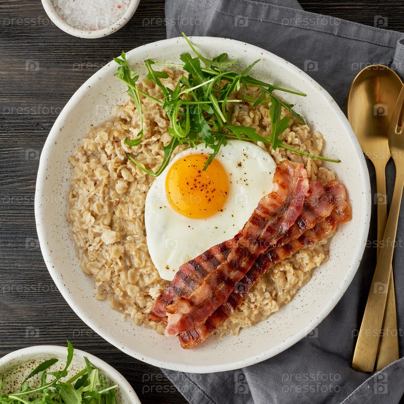 Овсянка, жареное яйцо и жареный бекон. Жестокий мужчина, спортивный завтрак. Сытный жирный калорийный завтрак, источник энергии. Баланс белков, жиров, углеводов. Сбалансированное питание. Макрос