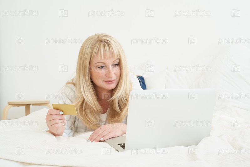 Женщина средних лет делает покупки в Интернете. Портрет зрелой красивой блондинки держит кредитную карту и пользуется ноутбуком, лежа на кровати дома