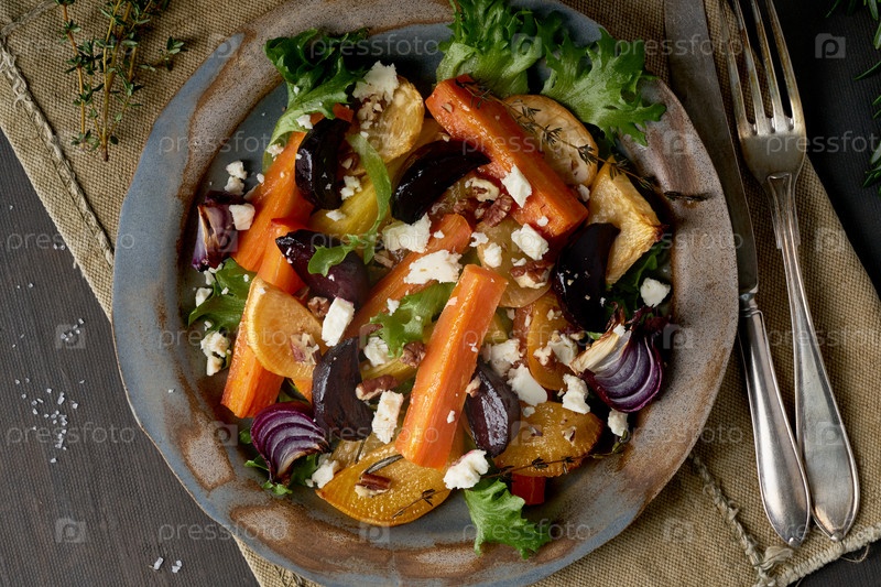 Вегетарианский салат из овечьего сыра, запеченные жареные овощи, кето-кетогенная диета. Смесь моркови, свеклы, репы, брюквы, лука и орехов. Чистое питание. Вид сверху