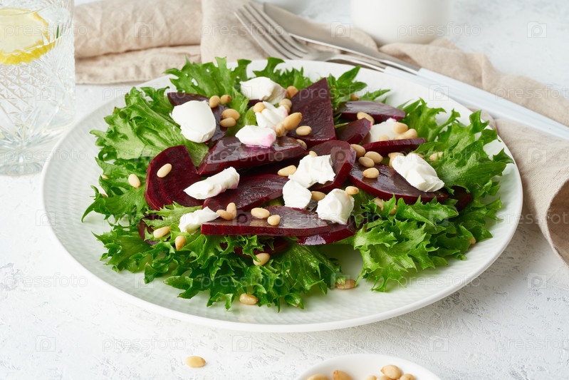 Салат со свеклой, творогом, фетой, рикоттой и кедровыми орешками, листьями салата. Здоровая кето-кетогенная диета, вид сбоку