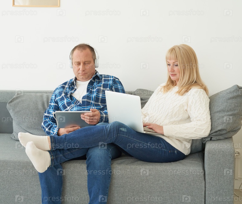 Полнометражный портрет зрелой пары с цифровой зависимостью дома