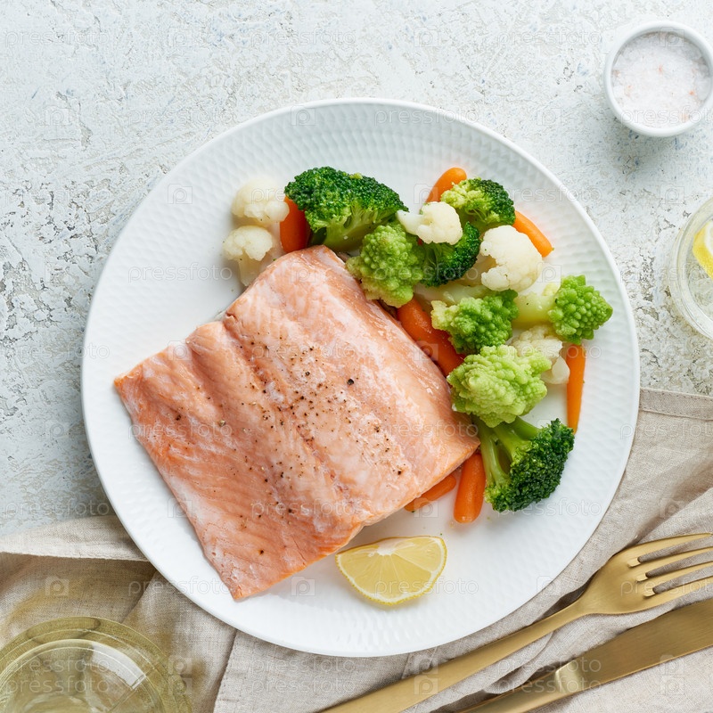 Паровой лосось и овощи, Палео, кето, фодмап, даш-диета. Средиземноморская диета с рыбой, приготовленной на пару. Здоровая концепция, белая тарелка на сером столе, без глютена, без лектина, вид сверху