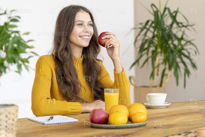 Молодая девушка кусает красное яблоко, улыбаясь. Красивая женщина с длинными волосами я
