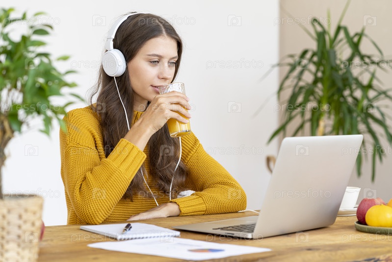 Молодая девушка в наушниках разговаривает по конференц-связи, пьет апельсиновый сок, улыбается. Красивая женщина с длинными волосами в ярко-желтом свитере работает удаленно из дома