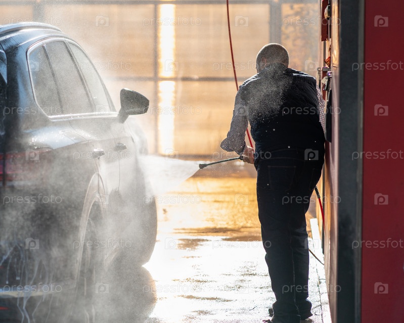 Мужчина моет машину на автомойке, льет воду из шланга. Солнечный свет и брызги воды по контуру