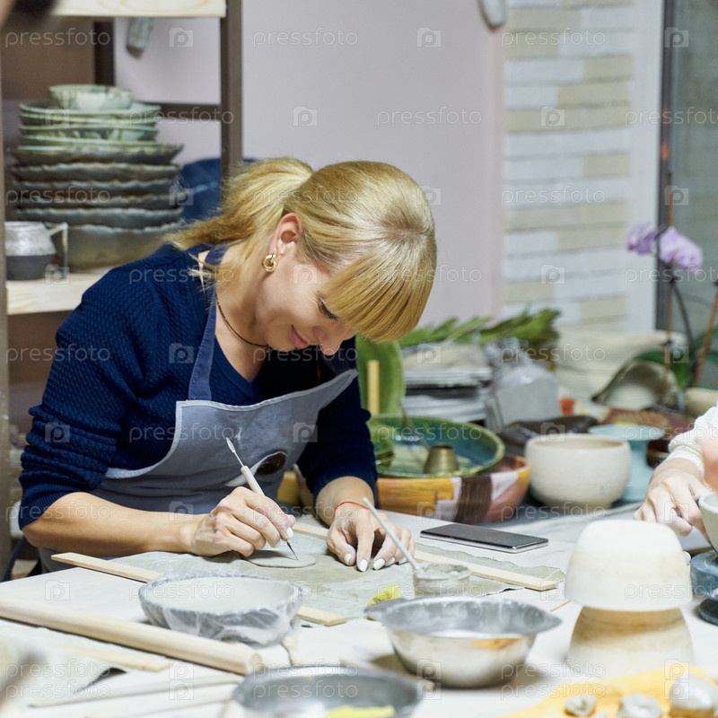 Женщина делает керамическую посуду в мастерской. Концепция для женщины-фрилансера, бизнеса. Ручная работа