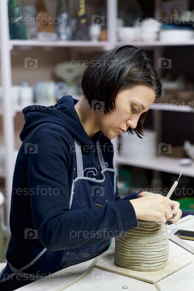Женщина занимается изготовлением керамической посуды. Концепция для женщины-фрилансера, бизнеса