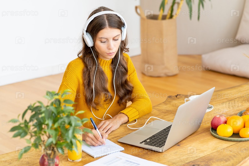 Счастливая женщина в беспроводных наушниках изучает онлайн-курс, пользуется компьютером и пишет в блокноте