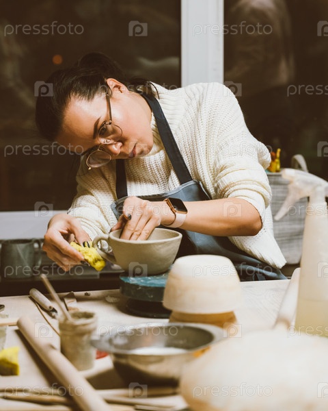 Женщина делает керамическую посуду в мастерской. Концепция для женщины-фрилансера, бизнеса. Ручная работа