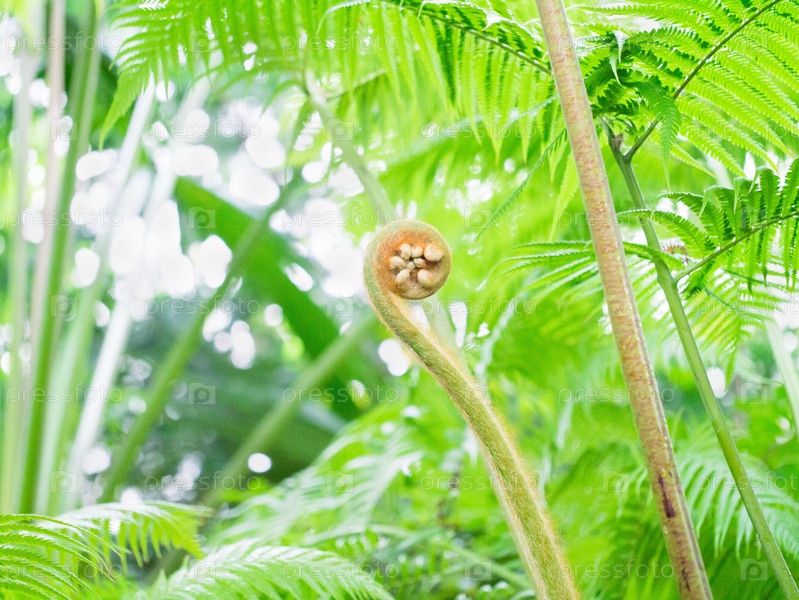 Новый лист зеленого папоротника на тропическом фоне