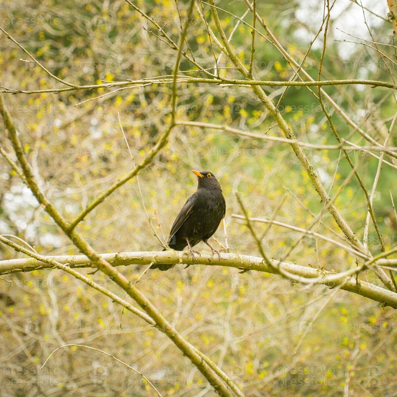 Черный дрозд сидит на ветке в весеннем лесу. Дрозд в природе