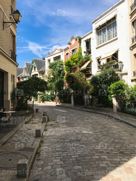 Прогулка по центру Парижа, знаменитому району Монмартр, красивой улице с деревьями, домами и кафе