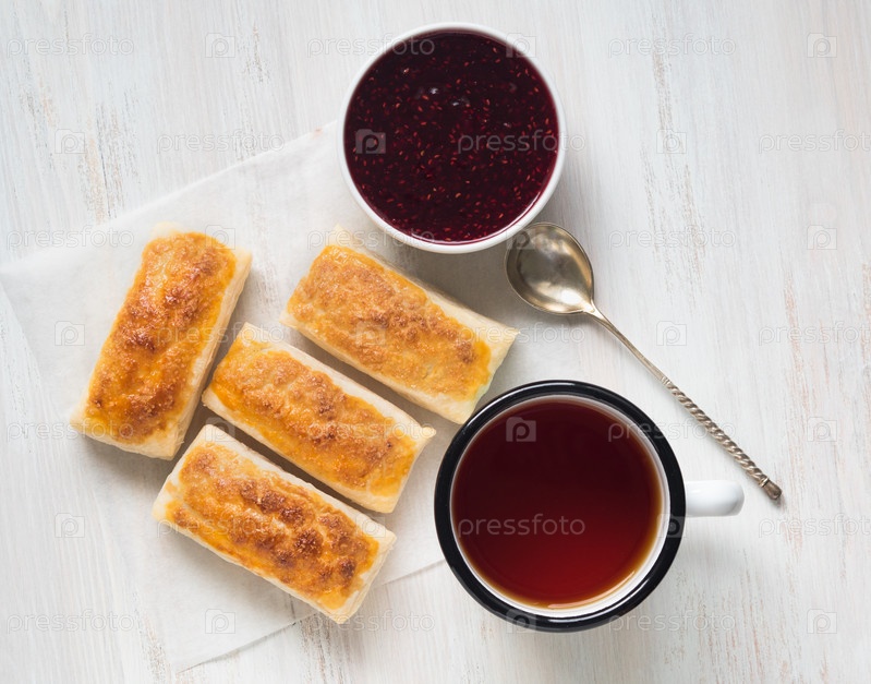 Завтрак из сладких булочек из слоеного теста, малинового варенья, чашки чая на пергаментной бумаге