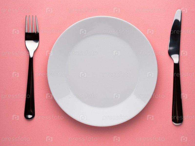 Пустая плоская тарелка, нож, вилка на розовом столе, вид сверху