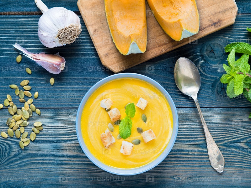Сливочный суп из тыквы с гренками и семенами на синем деревянном фоне, чеснок, мята, кусочки тыквы. Вид сверху