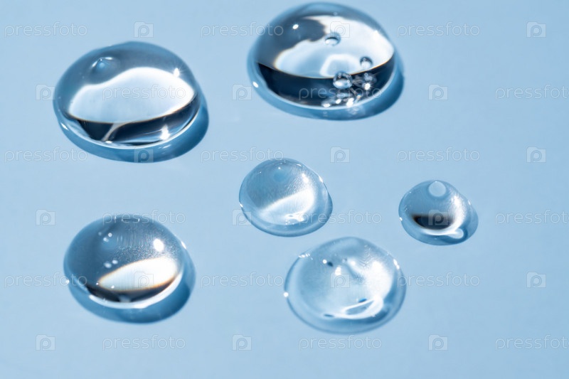 Чистые прозрачные капли косметического геля на синем фоне, текстура глицерина для ухода за кожей